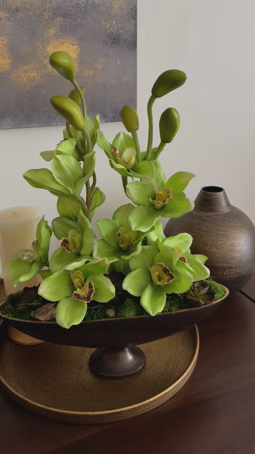 Discover luxury with our exquisite Green Orchid Arrangement, elegantly showcased in a rare and elegant bronze vase. Perfect for summer and ideal for year-round enjoyment in both home and office spaces, this arrangement is designed to elevate your decor with sophistication and charm. Handcrafted with meticulous attention to detail, our centerpiece features premium realistic orchids in green color, some succulents, piece of grapewood and preserved moss, creating a lush, unique and captivating display. Whether adorning a living room, brightening up a reception area, or adding a touch of elegance to a study, this arrangement promises to be a stunning focal point wherever it is placed.